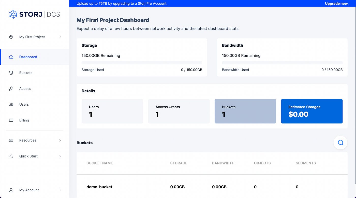 Storj has matured over the years into a expressionless-simple object storage solution that offers a competitive free tier including 150 GB. Dissimilarity this with the five GB AWS S3 offers. If you need more than storage, Storj will merely charge $4 per TB each month, while the AWS S3 price would exist around $23.
